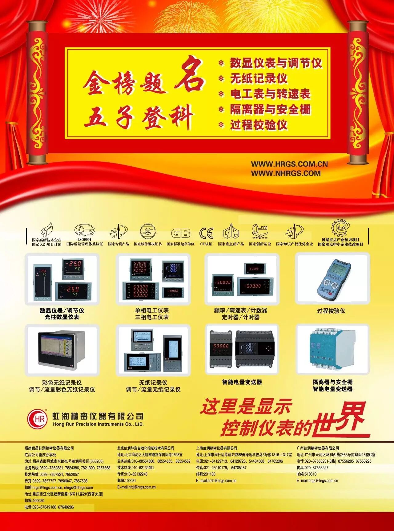 虹润集团公司是通过ISO9001和欧盟CE认证的国家级高新技术企业。“虹润”商标被国家工商局认定为“中国驰名商标”,公司产品已获得400多项专利,60余项国家软件版权,公司主持或参与起草31项工业自动化仪表国家标准的制定,隔离式安全栅取得近40项国家权威防爆安全部门颁发的防爆证。 目前公司花六年时间倾心研发了数显仪表/无超调高精度(±0.1%)调节仪、无纸记录仪、电力仪表与转速表、隔离器与安全栅、过程校验仪等五大系列产品,已成为显示控制仪表行业的主流产品。 Hongrun Group is a national high-tech enterprise.It has been Known as "China well-known trademark" by the state administration of industry and commerce. It has obtained ISO9001 International Quality Guarantee System certification and European Union CE certification.The products has got over 400 national patents and over 60 software copyright registrations,the safety barrier has got over 40 explosion-proof certificate issued by the security department. It has participant in drafting the 31 national standards for digital instruments. The company has taken 6 years to develop five series products including digital display controller®ulator,High precision without overshoot(High accuracy:±0.1%), paperless recorder, power meter&techometer,isolator&safety and process checking meter. They are has to be the main products for display controller in instruments field.