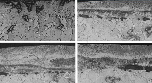 一般钢铁材料在进行激光表面相变硬化时,其表层是熔化的,为了加深表层硬化层才使表层熔化。表层熔化时,可使合金元素溶入表层基体材料中,以提高表面耐磨蚀性、耐磨性和抗冲击强度等。这种表面处理有表面合金化、表面涂覆、非晶化和快速熔凝等。